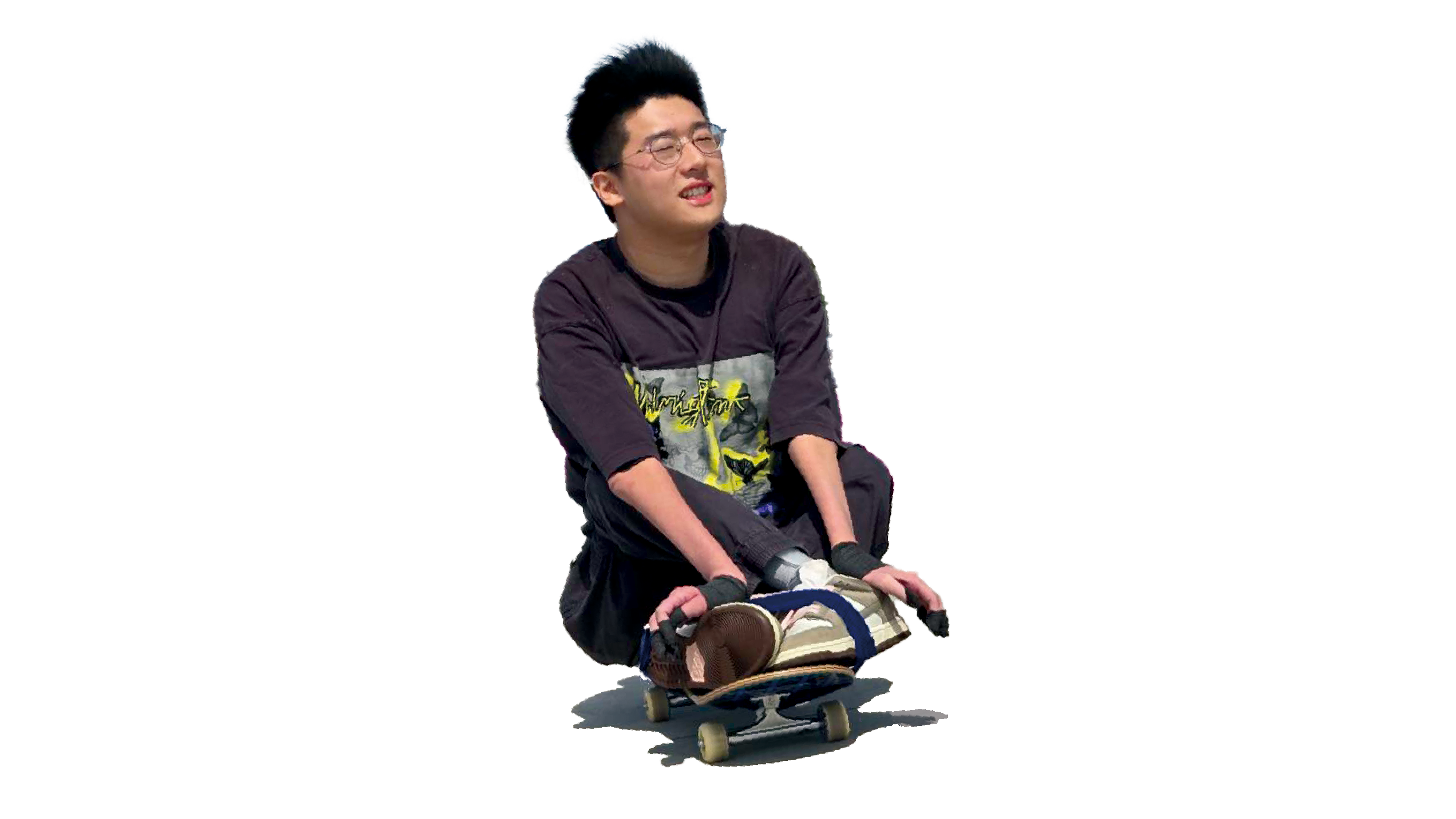 國中時,他在網路上看到國外身障滑板影片,第一個念頭只有一個字:「酷。」從此開始自學,看影片、反覆嘗試,高中時已能挑戰上下斜坡、甩尾轉彎、翹板,甚至下階梯。他把自己的練習過程剪成影片分享,不只是記錄進步,更像是在對世界宣告——他也能帥氣地玩一項「不被預期」的運動。